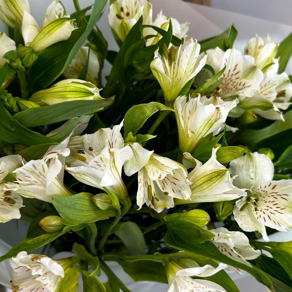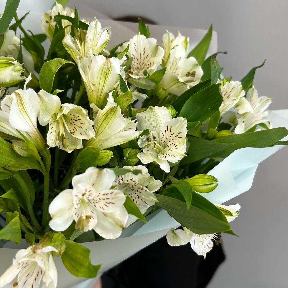 Альстромерия – 9 шт.Упаковка дизайнерская – 2 шт.Лента атласная – 1 шт.Зелень – 2 шт.
