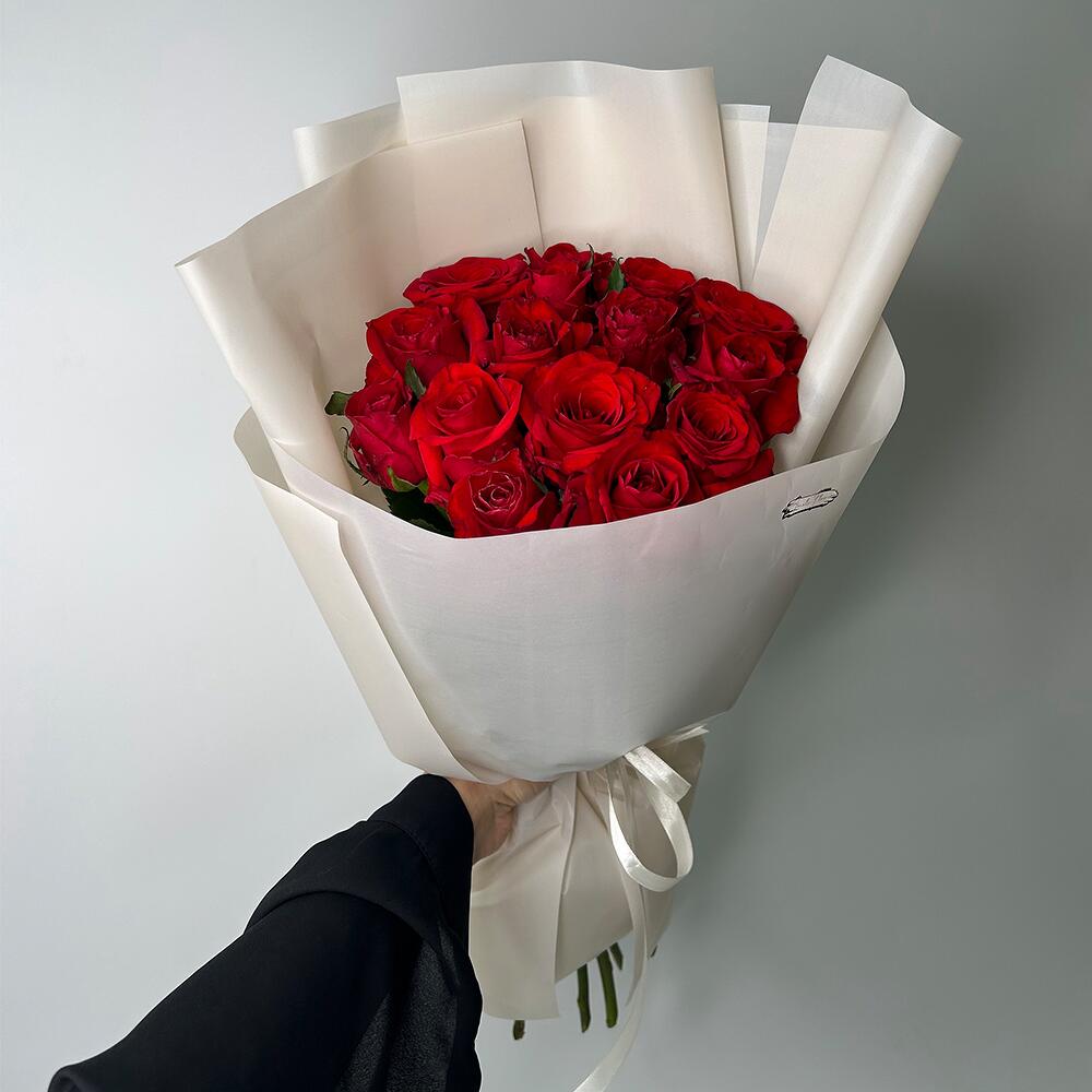 Класичний монобукет з 15 червоних троянд