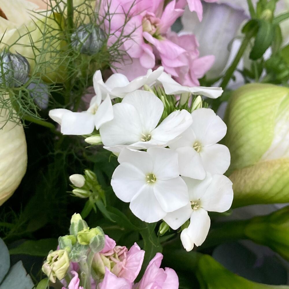 амариллис махровый – 3 шт.Колокольчик – 5 шт.Маттиола – 7 шт.Львиный зев – 5 шт.Флокс – 5 шт.Нигелла – 3 шт.Эвкалипт – 7 шт.Фисташка – 3 шт.Упаковка – 1 шт.