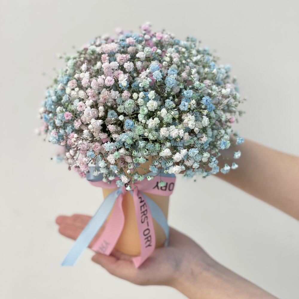 “Сиреневый туман” – композиция из гипсофилы в шляпной коробке