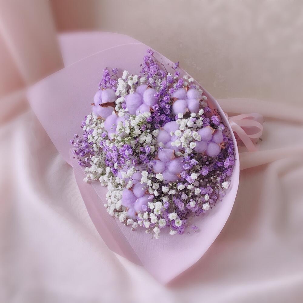 Хлопок – 9 шт.Лента атласная – 1 шт.Упаковка дизайнерская – 1 шт.гипсофила фиолетовая и белая – 5 шт.