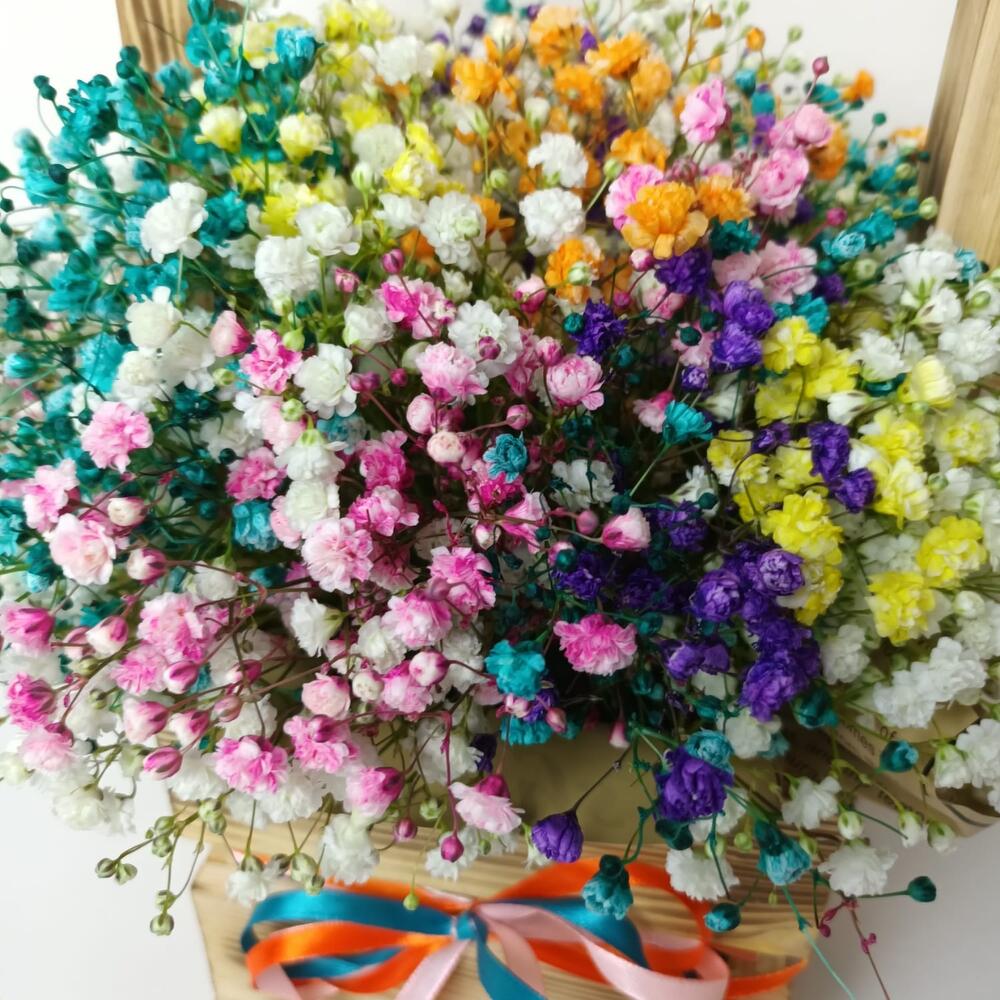 Позитивная разноцветная гипсофила в натуральном ящике вызовет радость и море улыбок