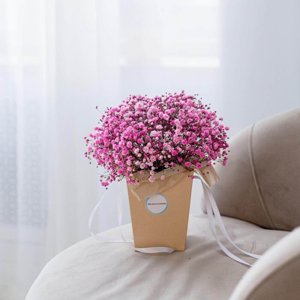 гипсофила цветная – 5 шт.Губка флористическая – 1 шт.Лента атласная – 2 шт.Сумочка картонная – 1 шт.