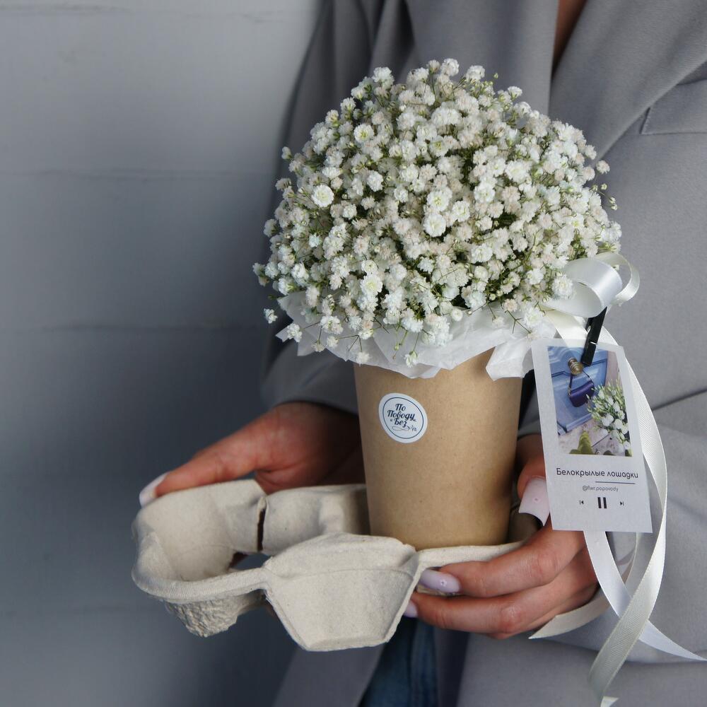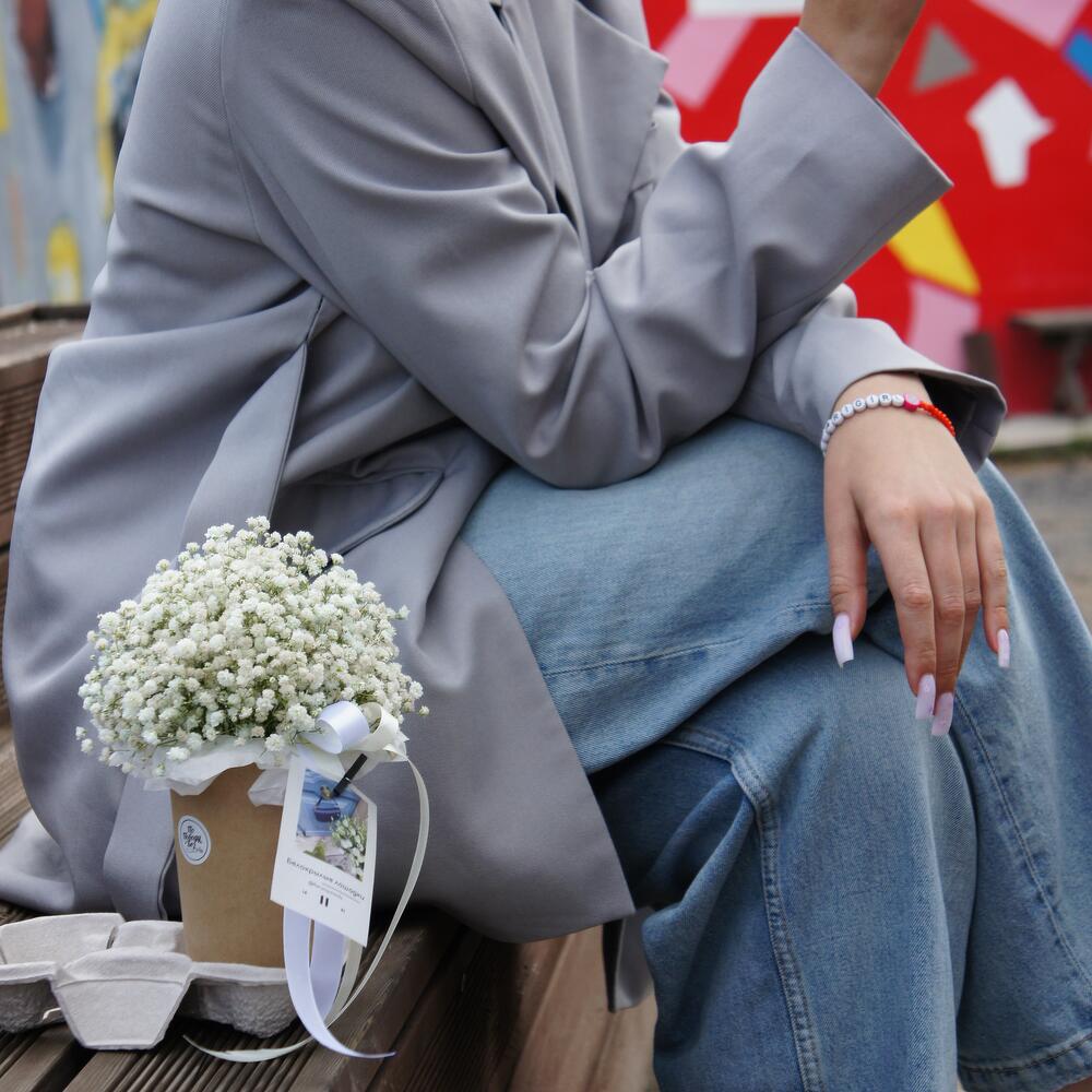 “Сиреневый туман” – композиция из гипсофилы в шляпной коробке