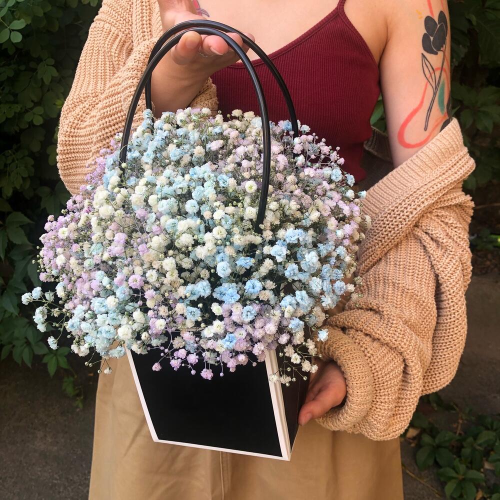 Композиция из цветной гипсофилы в сумке