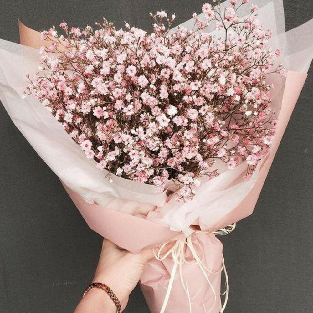 Гипсофила розовая – 3 шт.Тишью – 1 шт.Пленка – 1 шт.Лента – 1 шт.