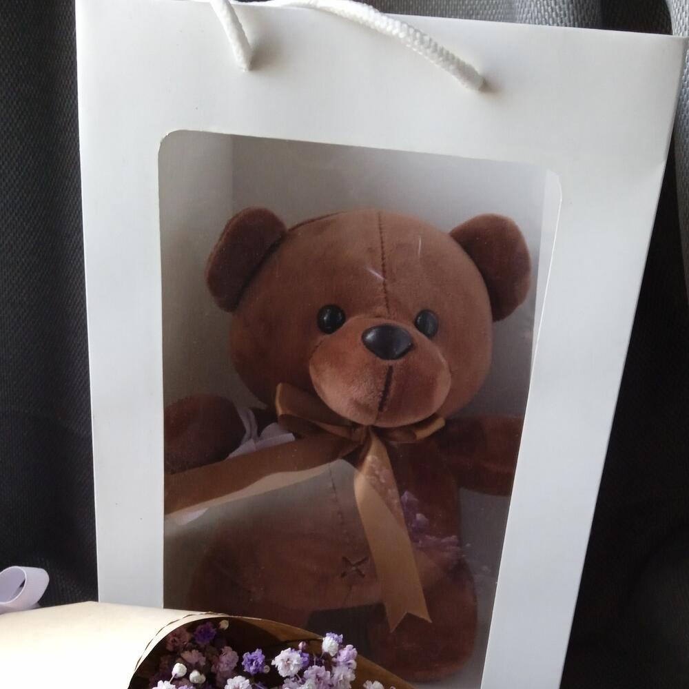 Гипсофила – 3 шт.Лента атласная – 1 шт.Крафт – 1 шт.Пакет подарочный – 1 шт.Мишка плюшевый – 1 шт.