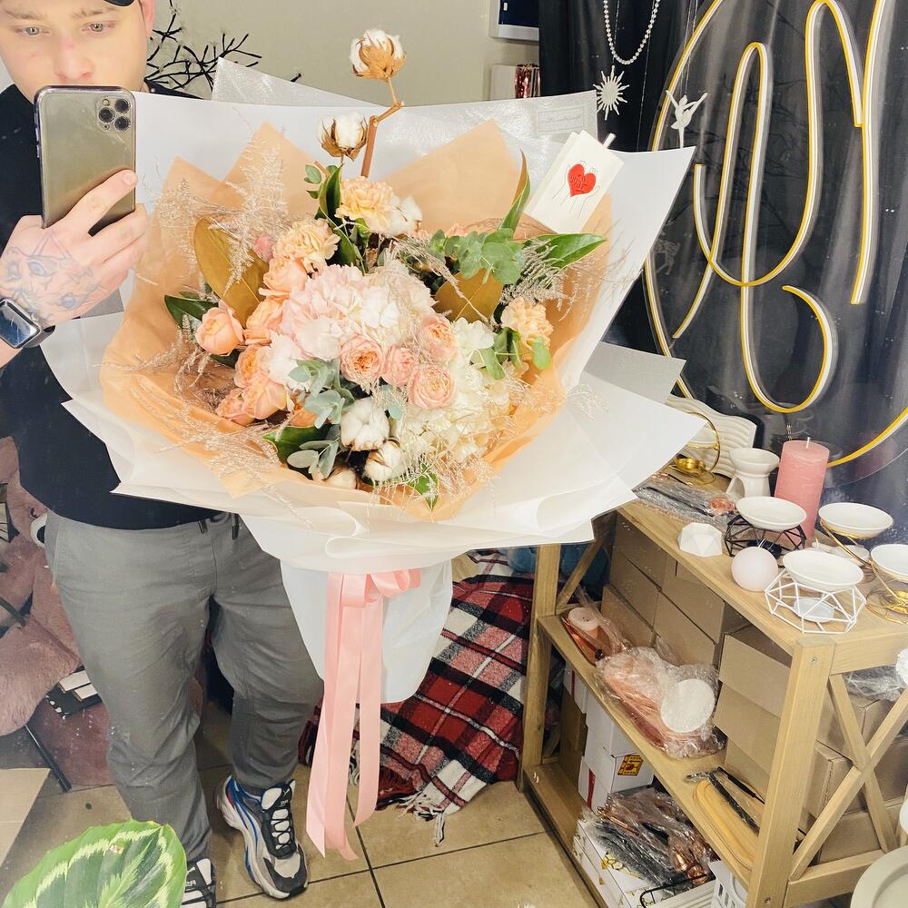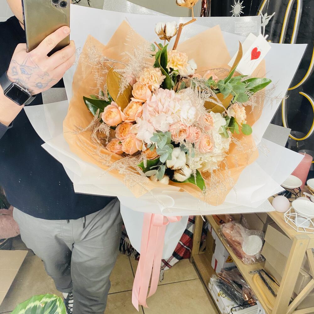 Неймовірно ніжний букет з кастових троянд піоновидних. У персикових спокійних кольорах з гортензіями, евкаліптом, листями магнолії і стабілізованого аспарагуса з діантусом! Натуральна бавовна додає йому щє більш сучасний вигляд і він великий в об’ємі! ( можна на фото побачити).