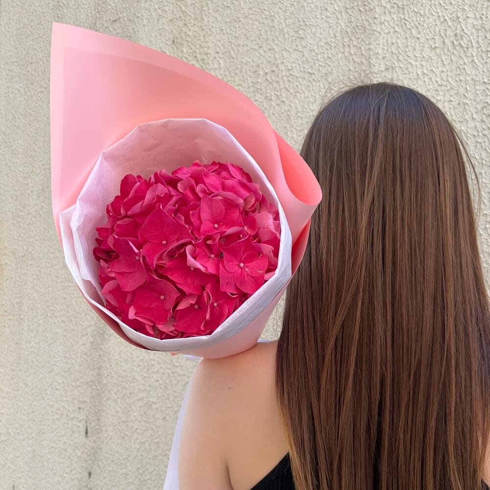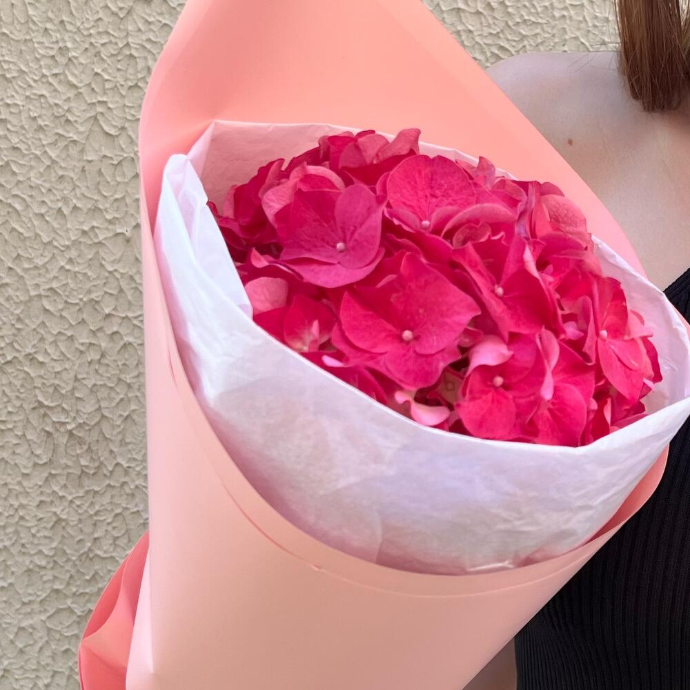 Лента атласная – 1 шт.Упаковка дизайнерская – 1 шт.Гортензия розовая – 1 шт.Упаковка тишью – 1 шт.подкормка для срезанных цветов – 1 шт.