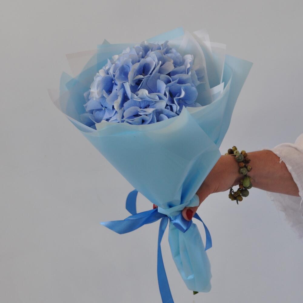 Лента атласная – 1 шт.Гортензия голубая – 1 шт.Пленка матовая – 4 шт.