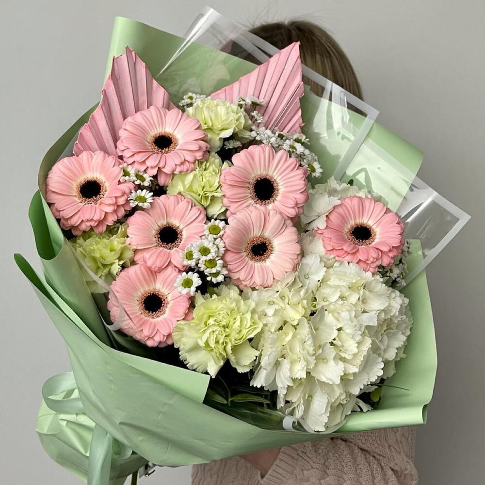 Гермини – 7 шт.Гортензия – 1 шт.Диантус – 4 шт.Сантини – 5 шт.Листья пальмы – 2 шт.Упаковка дизайнерская – 4 шт.Фисташка – 5 шт.