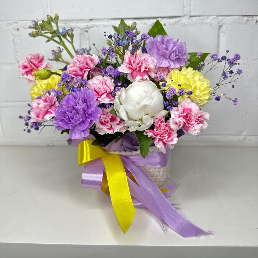 Диантус кустовой – 7 шт.Диантус – 4 шт.Оксипеталум – 2 шт.Гипсофила – 3 шт.Фисташка – 3 шт.Оазис флористический – 1 шт.Плетеное кашпо – 1 шт.