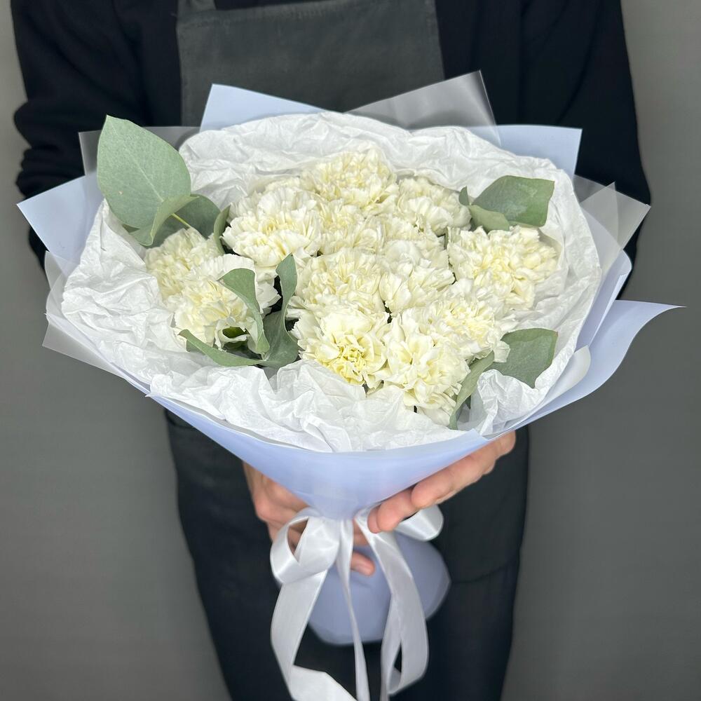 Монобукет из 15 белоснежных диантусов и ароматного эвкалипта "Океанический бриз"