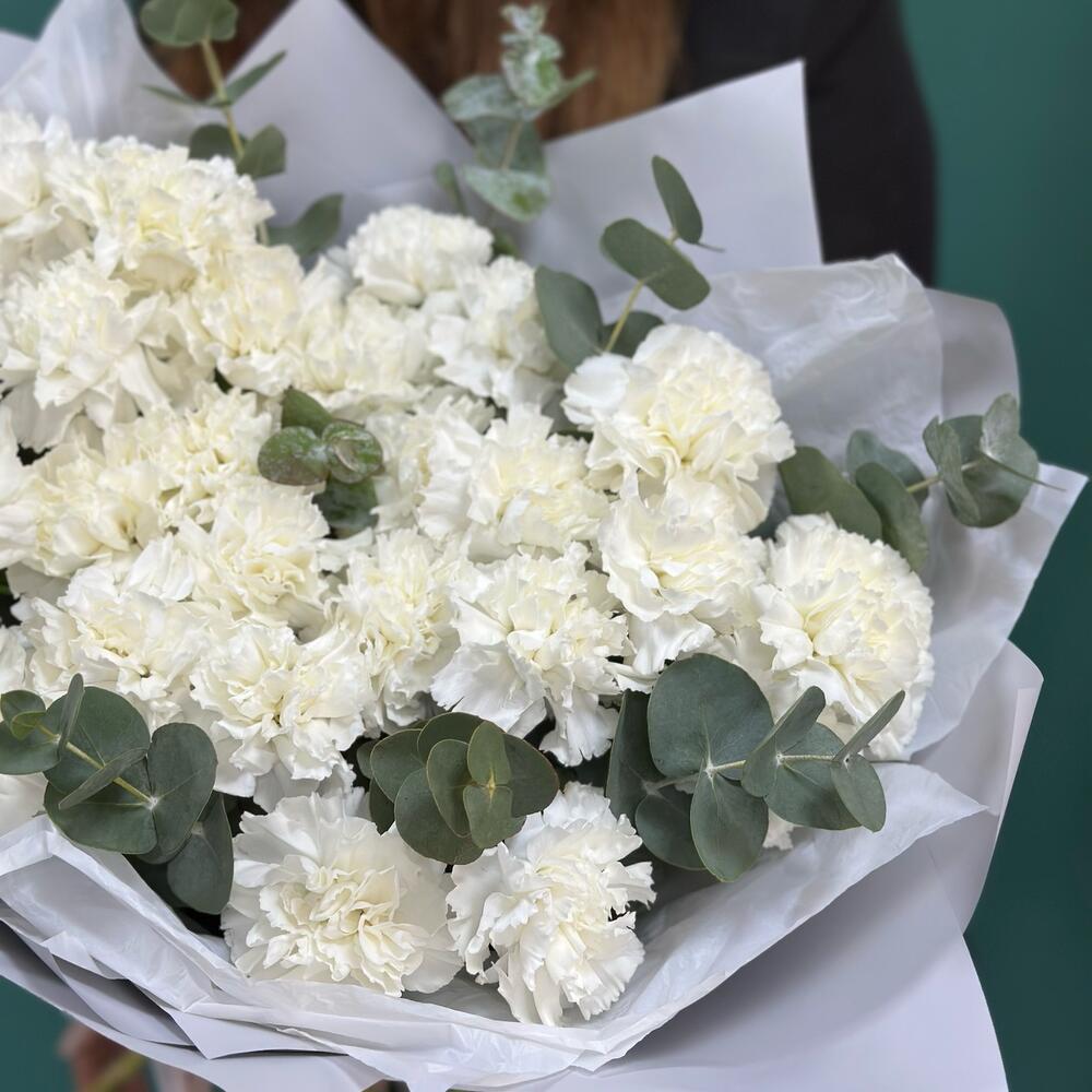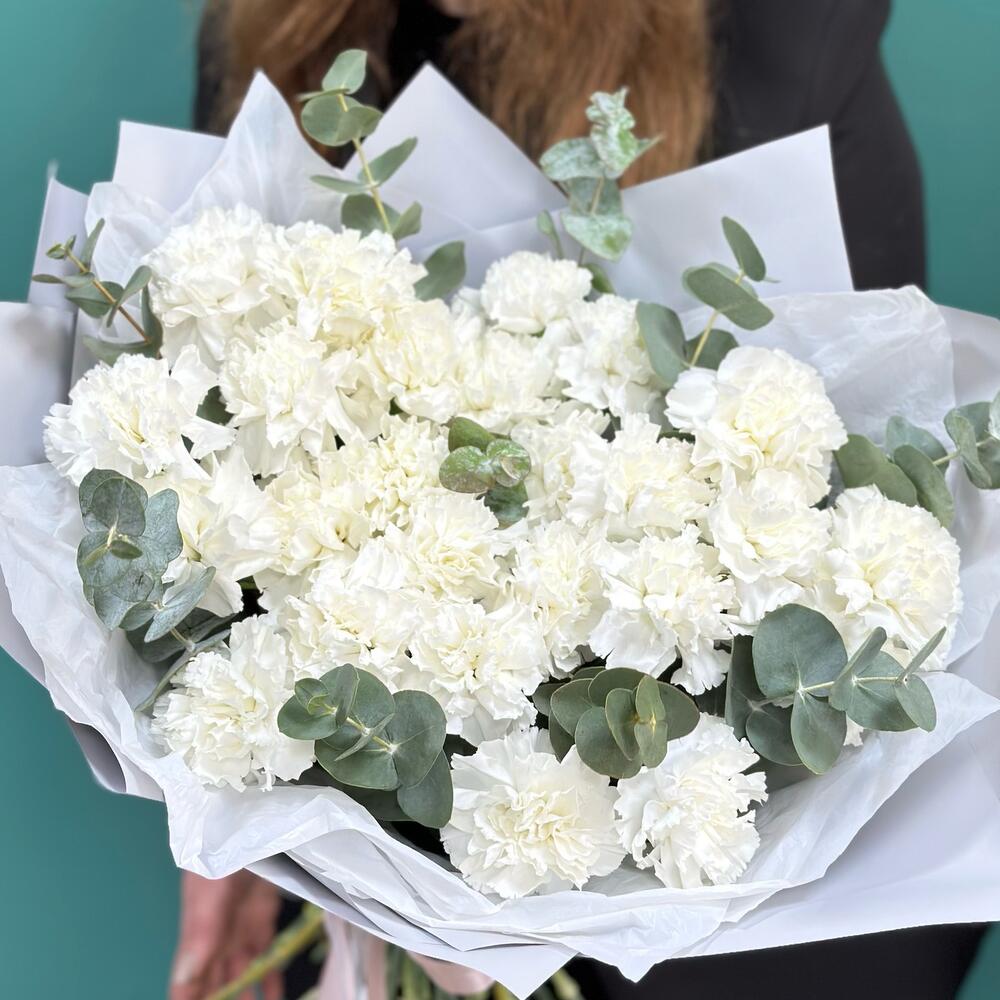 Эвкалипт – 1 шт.Лента атласная – 2 шт.современная упаковка с тишью – 2 шт.диантус сортовой (гвоздика) – 25 шт.