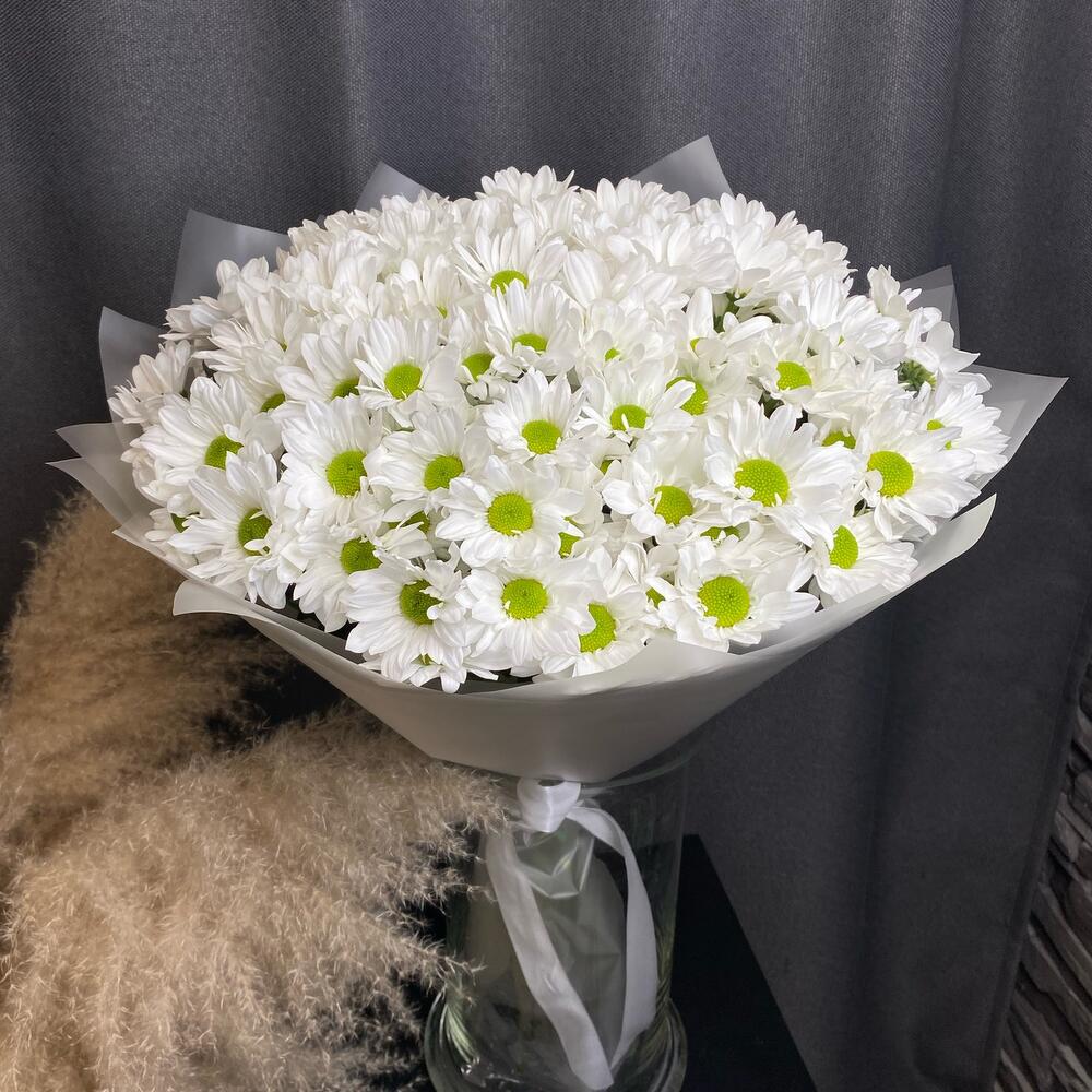 Хризантема кустовая – 15 шт.Дизайнерская упаковка – 1 шт.Лента атласная – 1 шт.