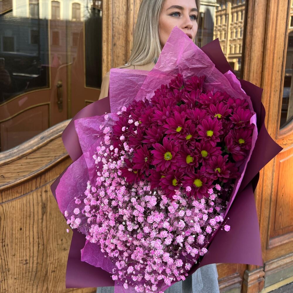 Гипсофила – 6 шт.Хризантема кустовая ромашковая – 5 шт.Тишью – 2 шт.дизанерская упаковка – 5 шт.Лента атласная – 2 шт.