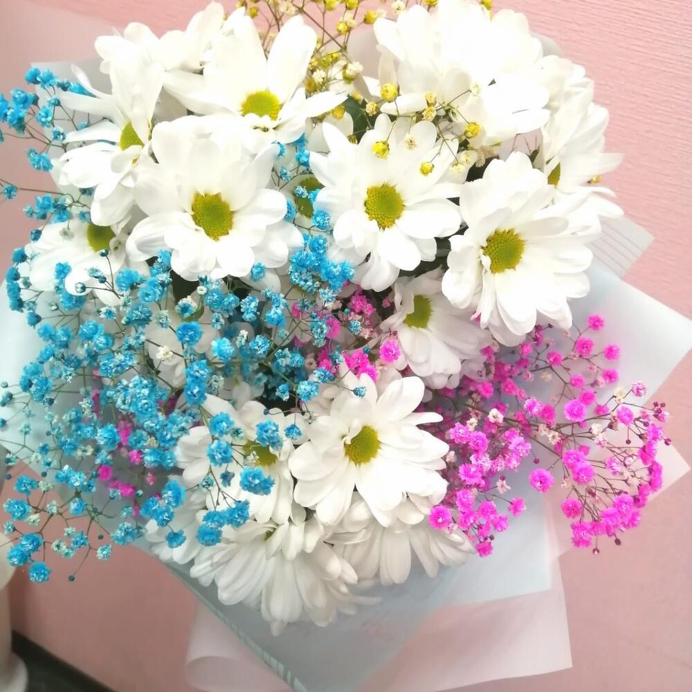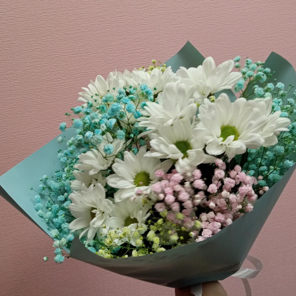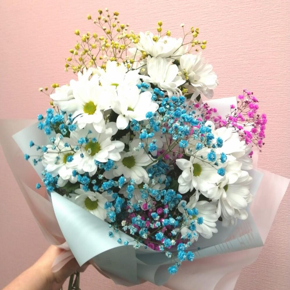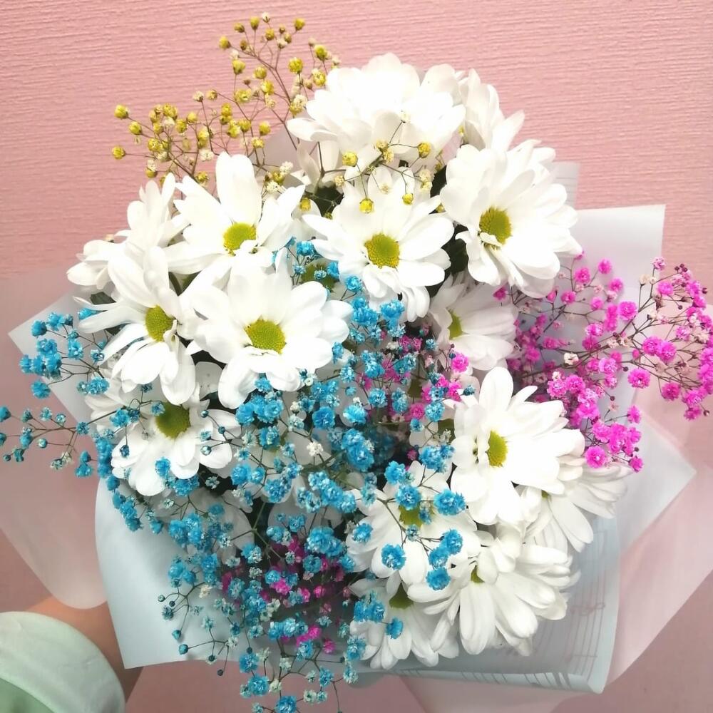 Лента – 1 шт.Хризантема кустовая – 3 шт.Упаковка – 1 шт.гипсофила радужная – 3 шт.
