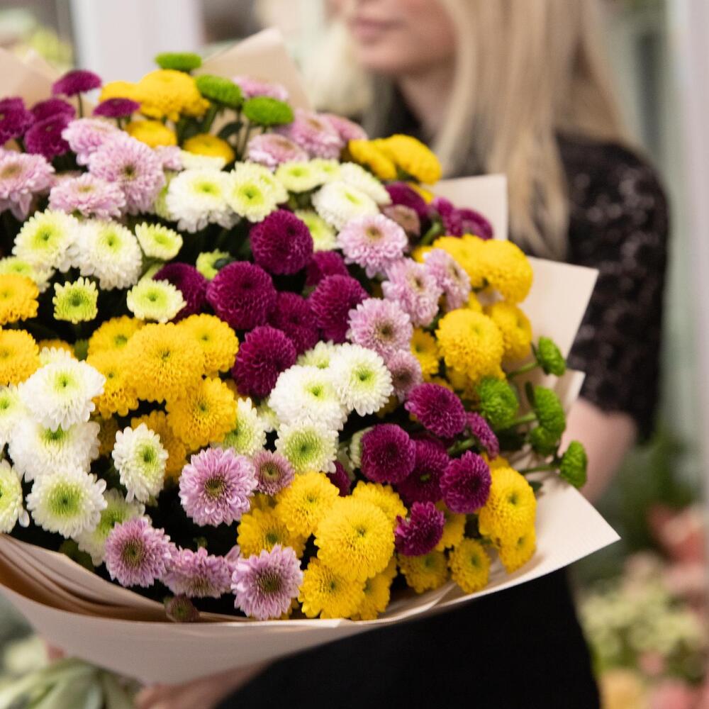 Хризантема кустовая Сантини – 25 шт.Открыточка с вашими пожеланиями – 1 шт.Дизайнерская упаковка – 1 шт.