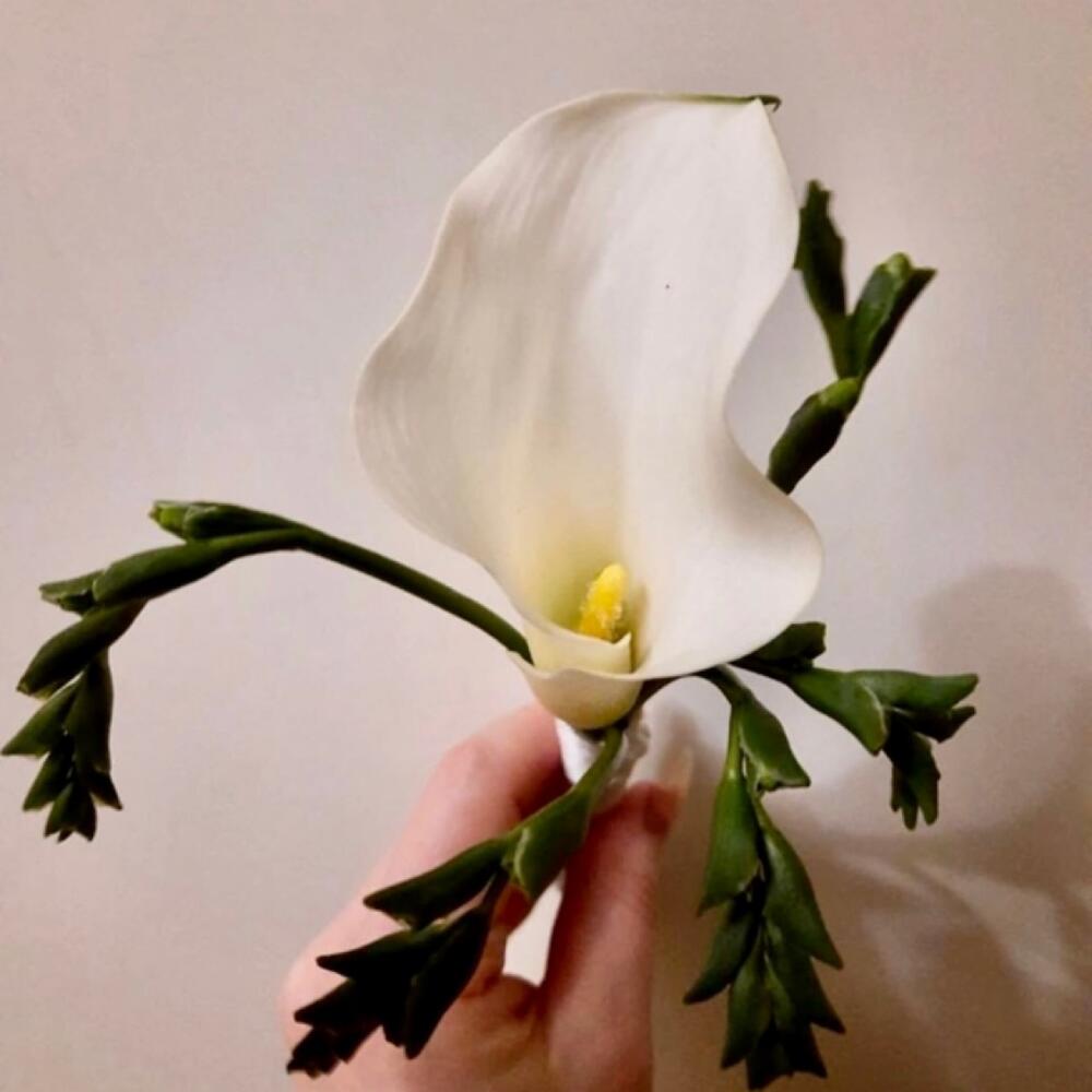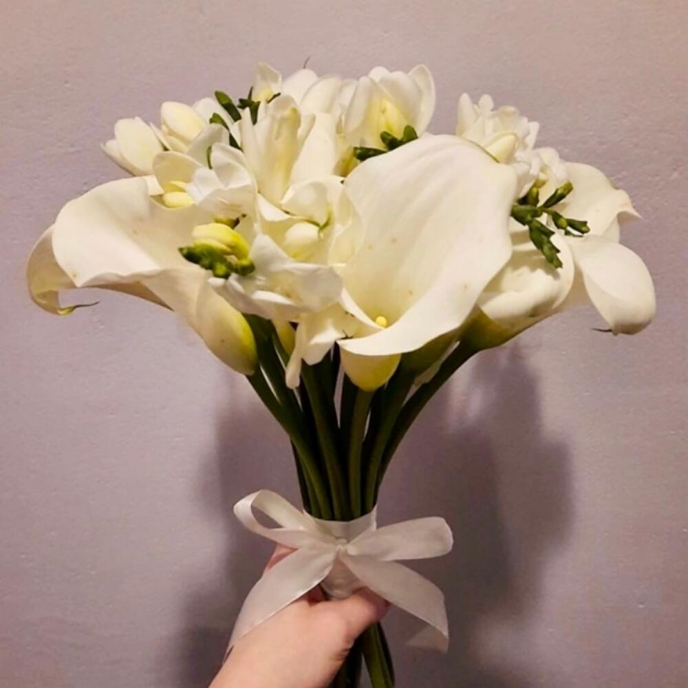 Лента атласная – 1 шт.Фрезия белая – 9 шт.Калла белая – 19 шт.бутоньерка для жениха – 1 шт.