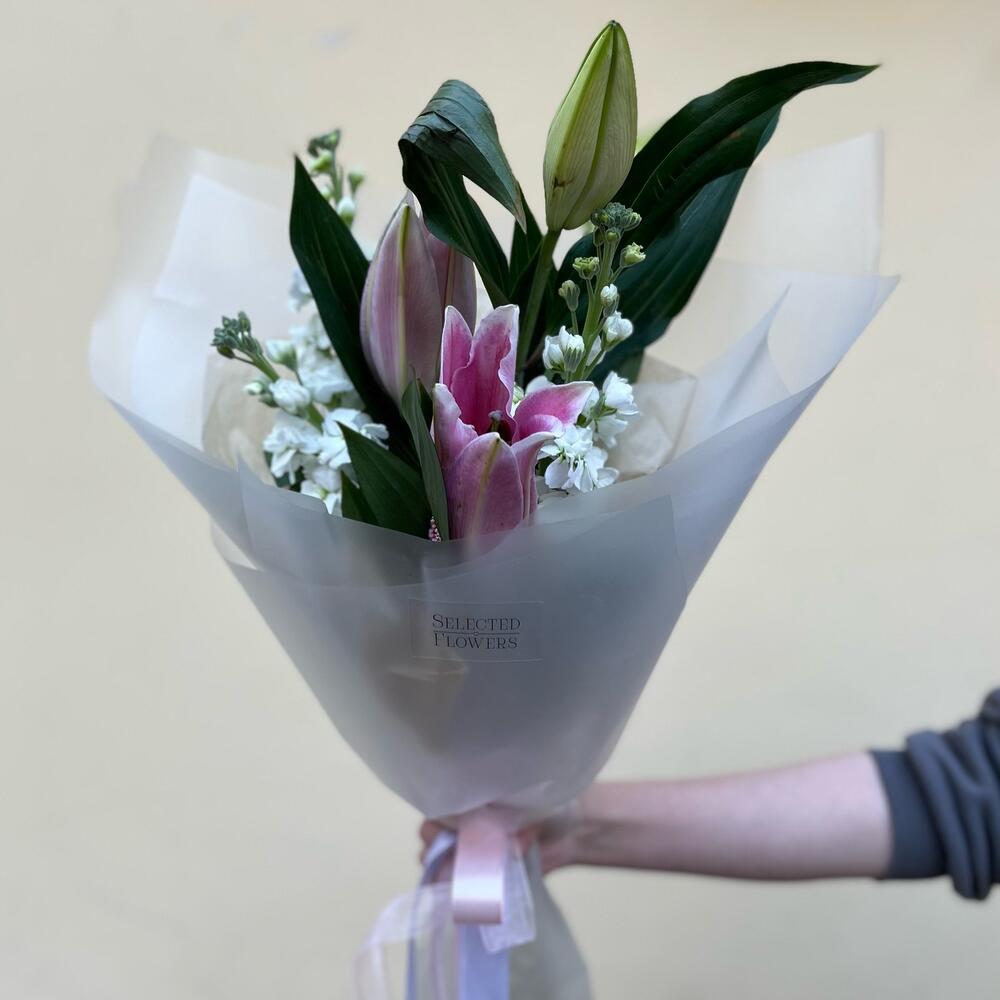 Маттиола – 3 шт.Озотамнус – 1 шт.Лилия розовая – 1 шт.Дизайнерская упаковка – 1 шт.