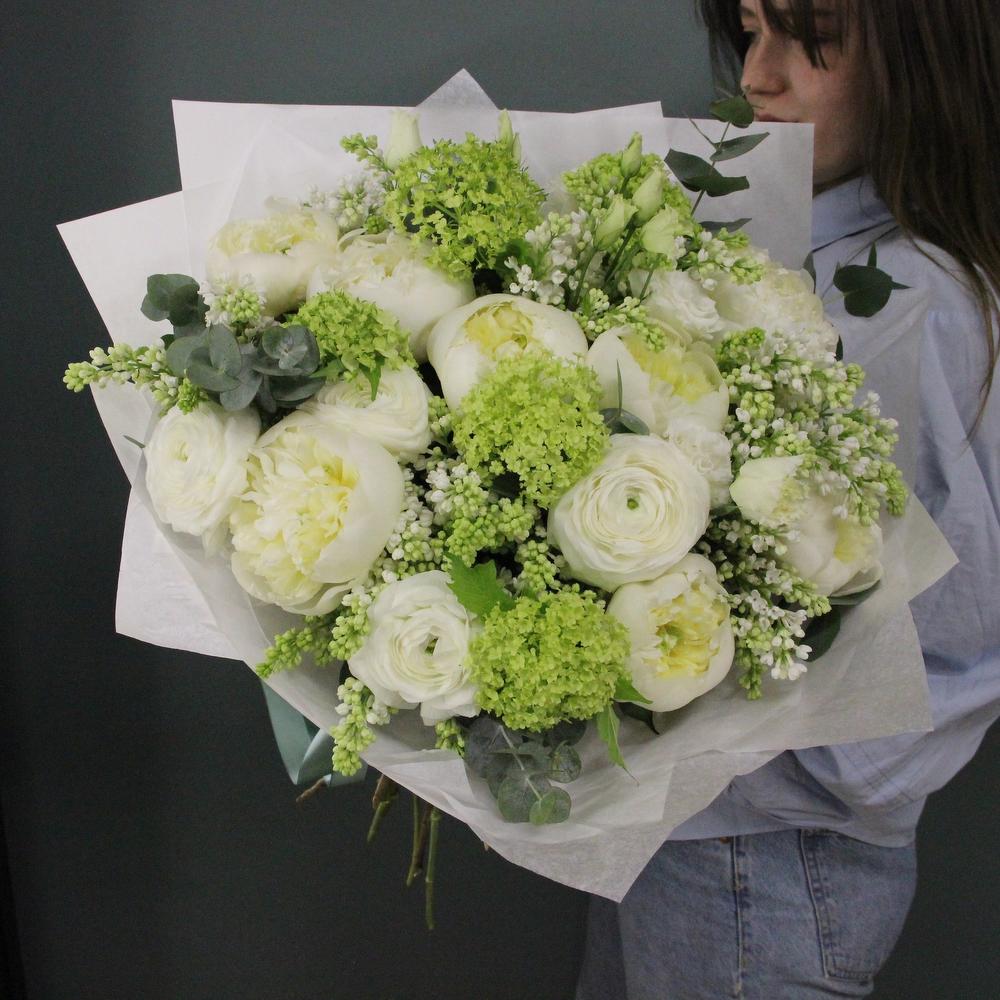 Лизиантус – 3 шт.Пион – 7 шт.Сирень – 4 шт.Эвкалипт – 7 шт.Упаковка – 1 шт.Калина – 4 шт.