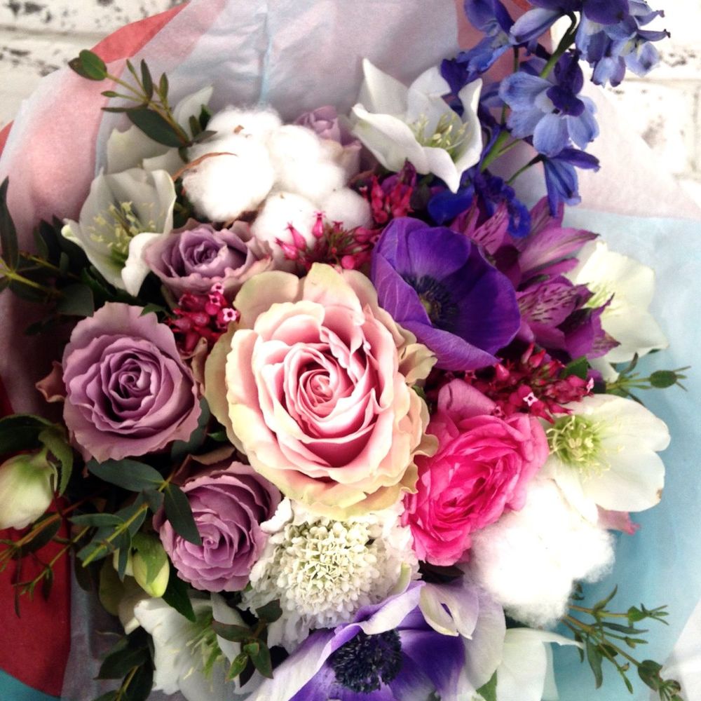 дельфиниум или лизиантус – 1 шт.Экзотика хлопок 80 см – 2 шт.Роза Эквадор – 5 шт.Гиацинт синий – 1 шт.Альстромерия белая – 1 шт.Альстромерия розовая – 2 шт.