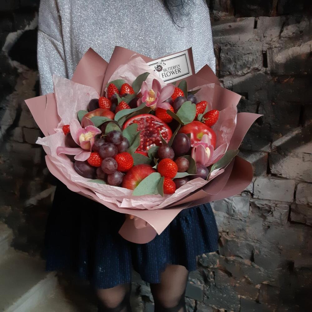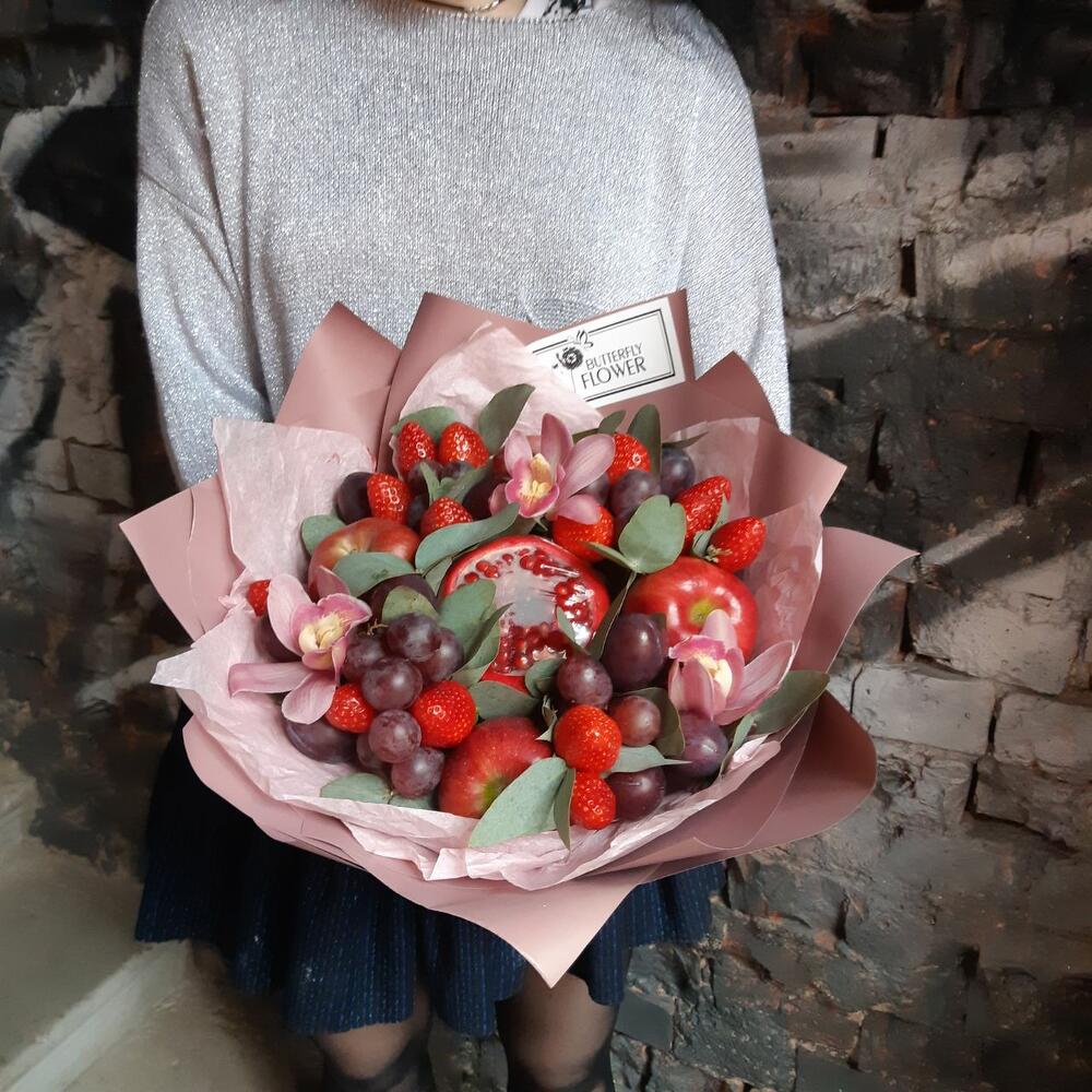 Контрастный и таинственный букет из фруктов с воланами орхидей и воздушными веточками паникума, букет, который приятно дарить и хочется получать