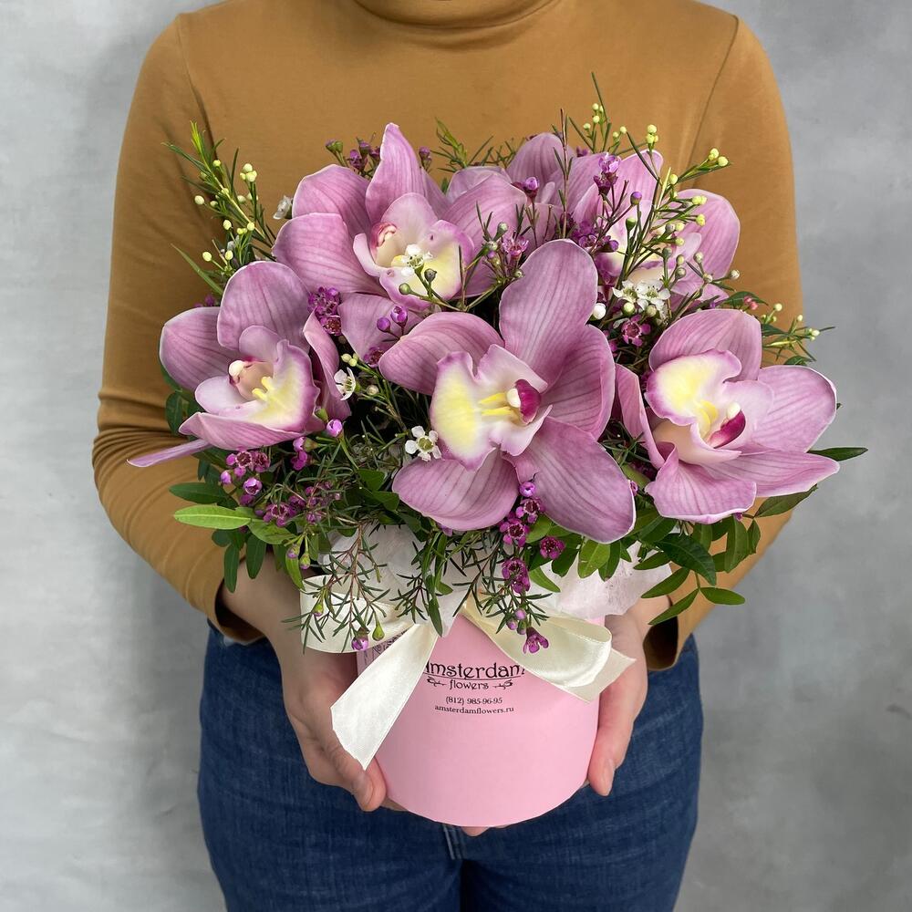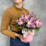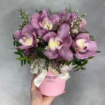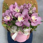 Розовые орхидеи с эустомой в коробке