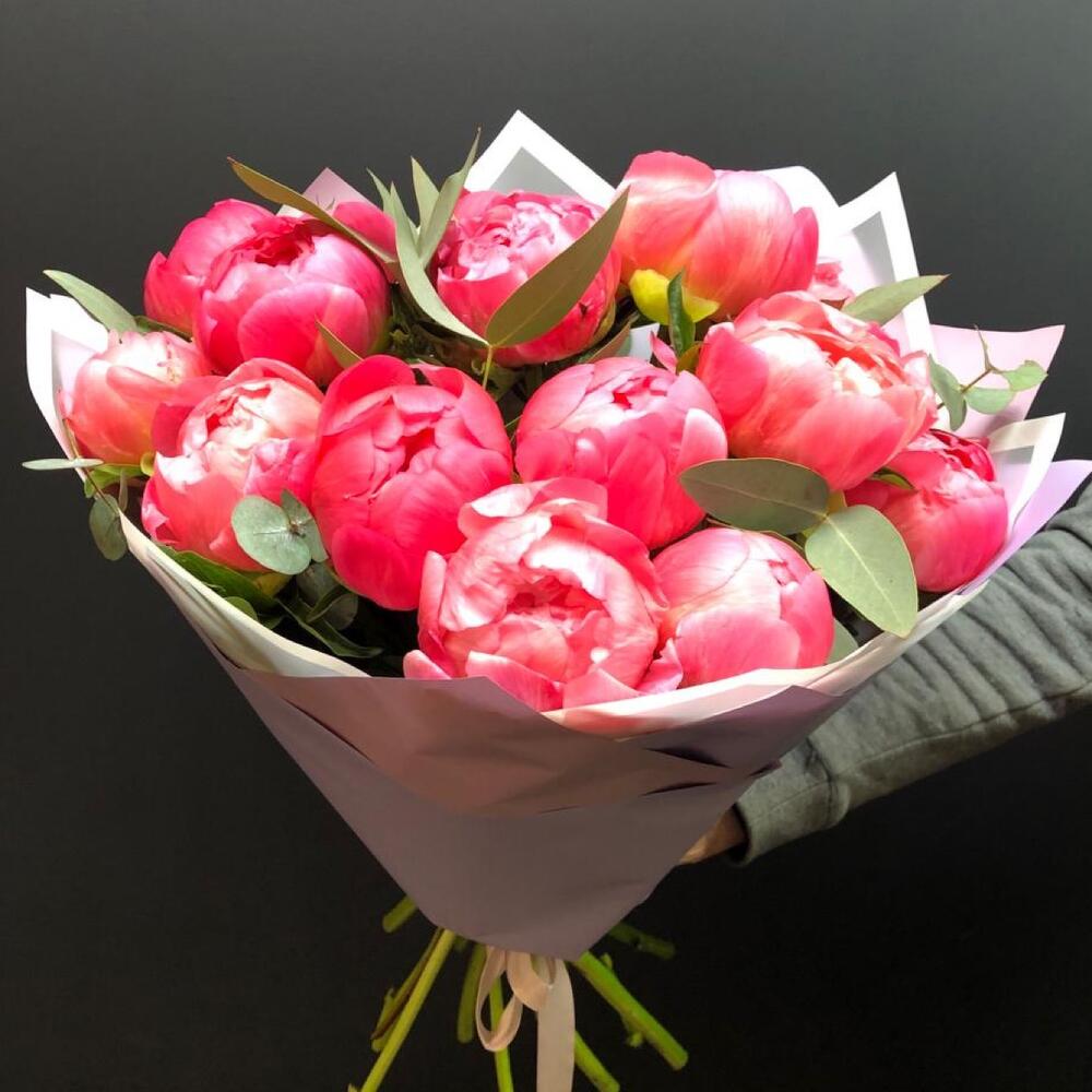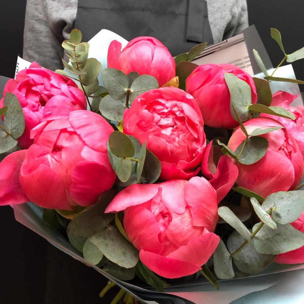 Пион – 9 шт.Эвкалипт – 5 шт.Упаковка дизайнерская – 1 шт.