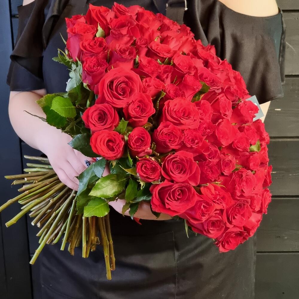 Роза кенийская 50 см – 101 шт.Пленка прозрачная – 1 шт.Лента атласная – 1 шт.