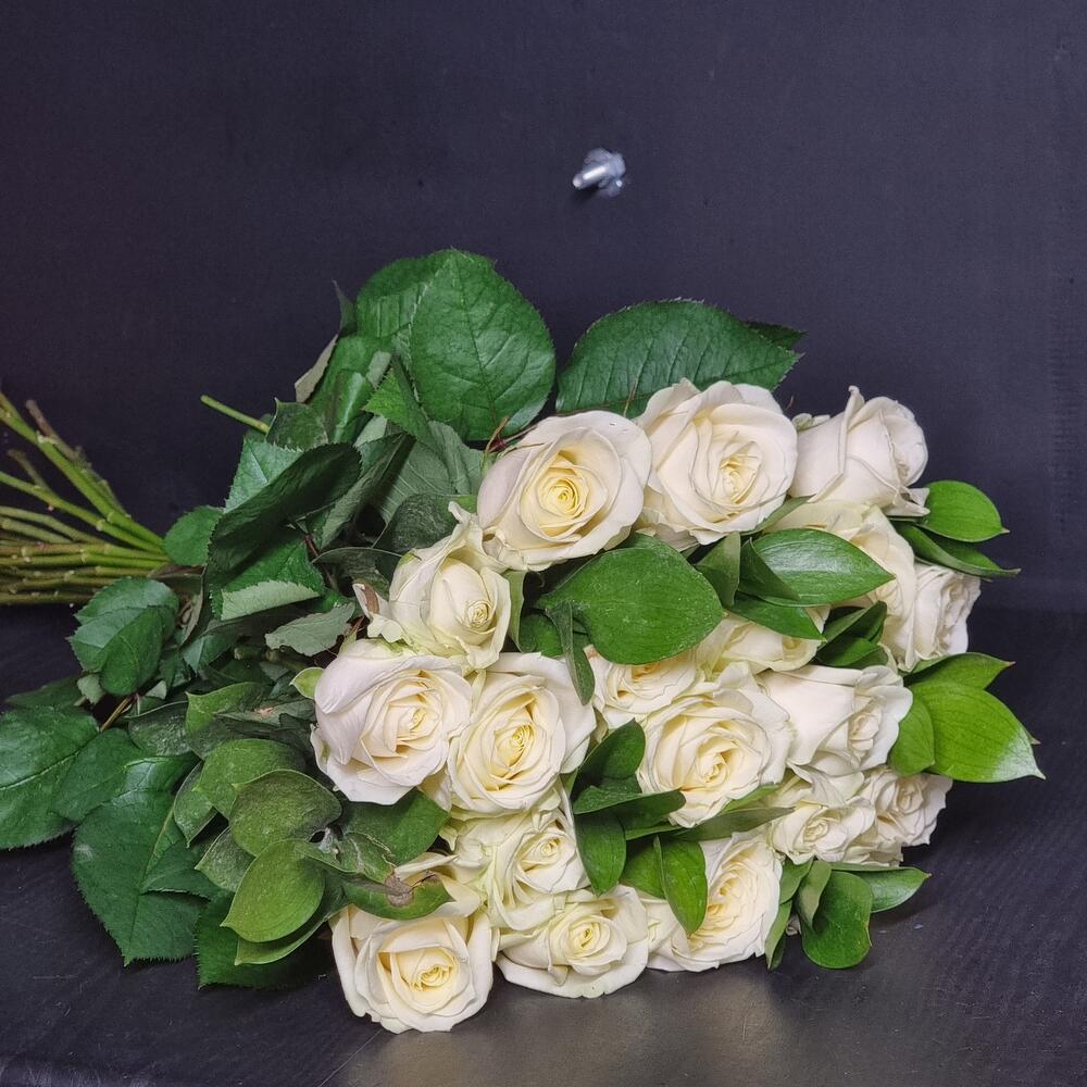 Роза Аваланж – 19 шт.Рускус сочи – 5 шт.Пленка прозрачная – 1 шт.Лента атласная – 1 шт.