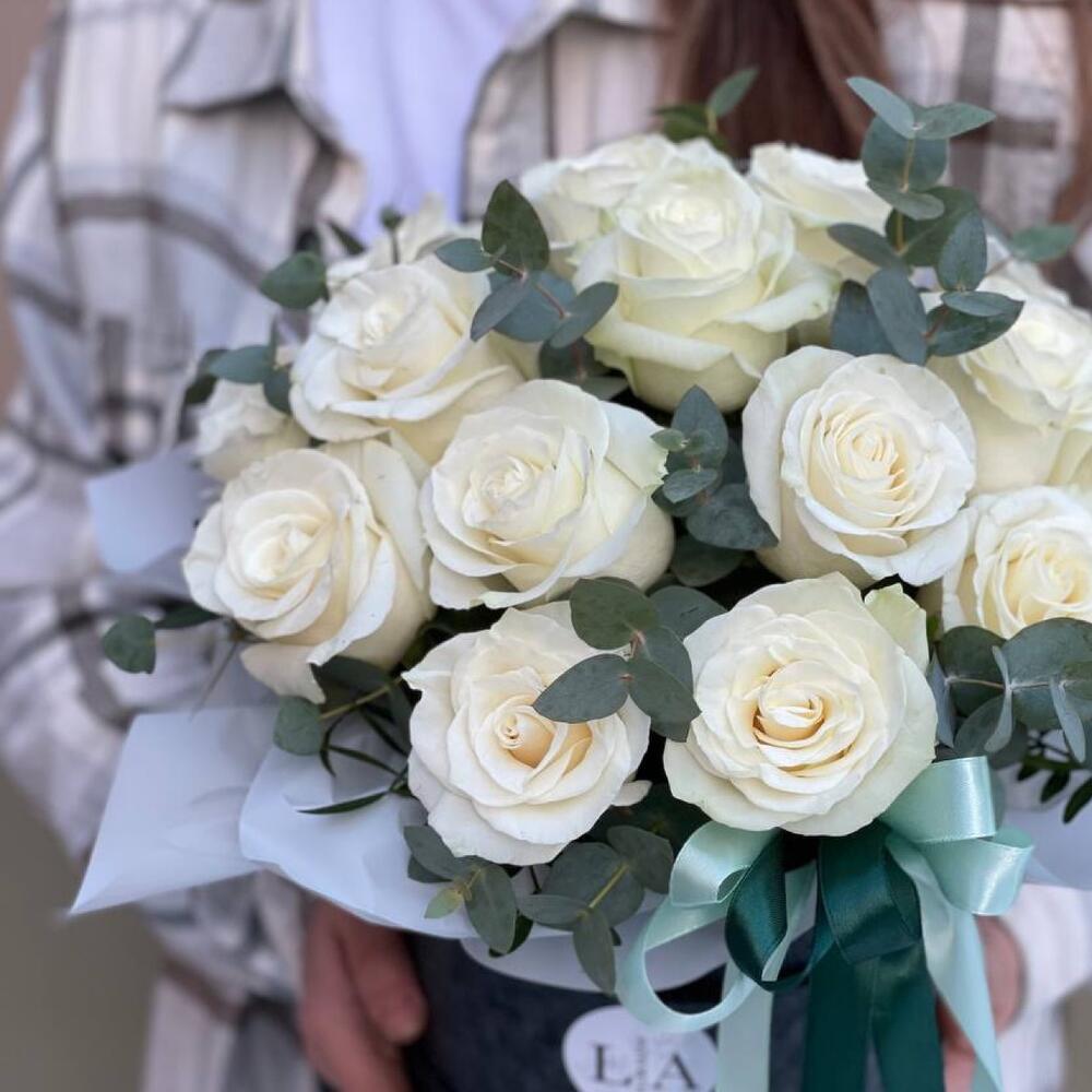 Эвкалипт – 5 шт.Роза Эквадор – 19 шт.Лента атласная – 2 шт.Коробка шляпная – 1 шт.Оазис флористический – 1 шт.