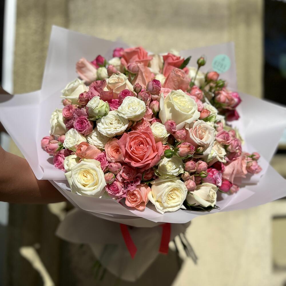 Альстромерии, Гвоздики, Кустовые розы, Лизиантусы, Розы, Хризантемы
