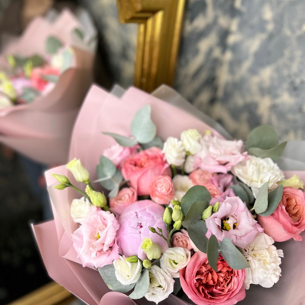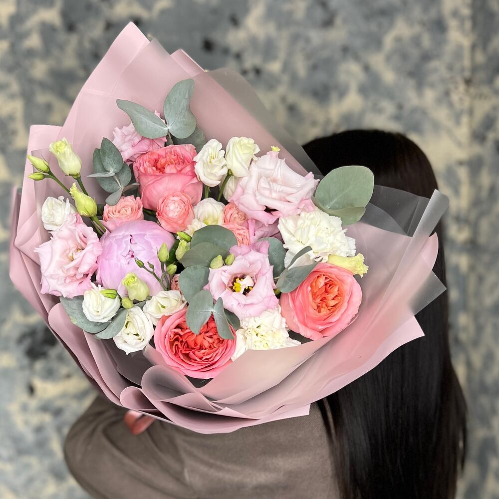 Эвкалипт – 3 шт.Лента атласная – 2 шт.Диантус – 2 шт.Пион Сара Бернар – 1 шт.Пленка матовая – 5 шт.эустома розовая махровая – 1 шт.эустома белая – 2 шт.Роза кустовая пионовидная мадам бомбастик – 1 шт.роза пионовидная пинк экспрешн – 3 шт.