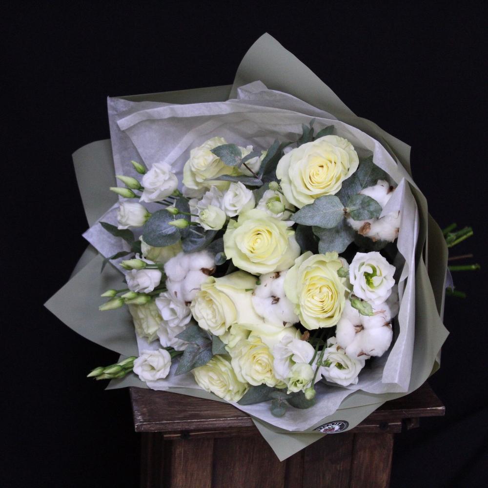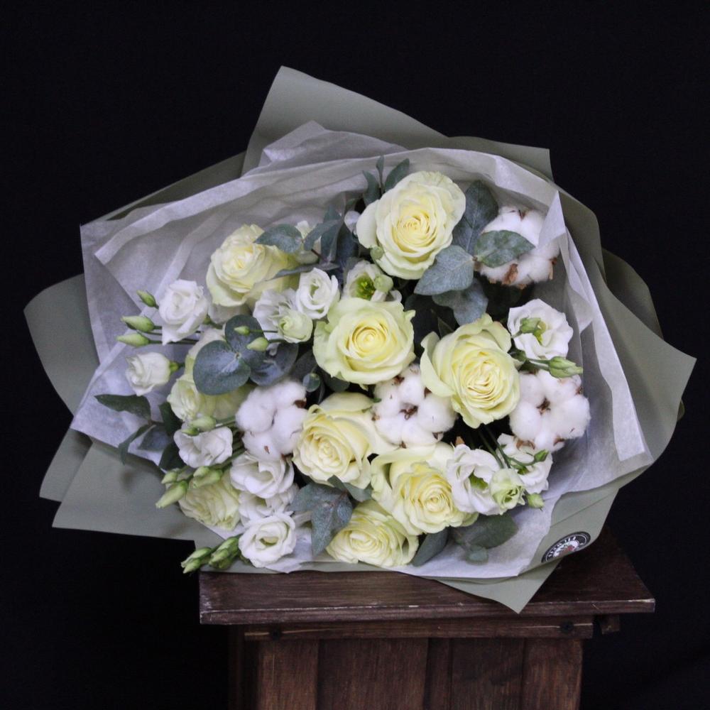 Альстромерии, Гвоздики, Кустовые розы, Лизиантусы, Розы, Хризантемы