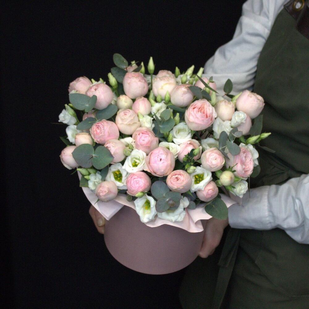 роза мэнсфилд парк – 6 шт.эустома белая – 7 шт.Эвкалипт Baby Blue – 3 шт.Коробка шляпная – 1 шт.Оазис флористический – 1 шт.