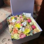 Букет из цветов и макаронс в декоративной коробке “Сладкое солнце”