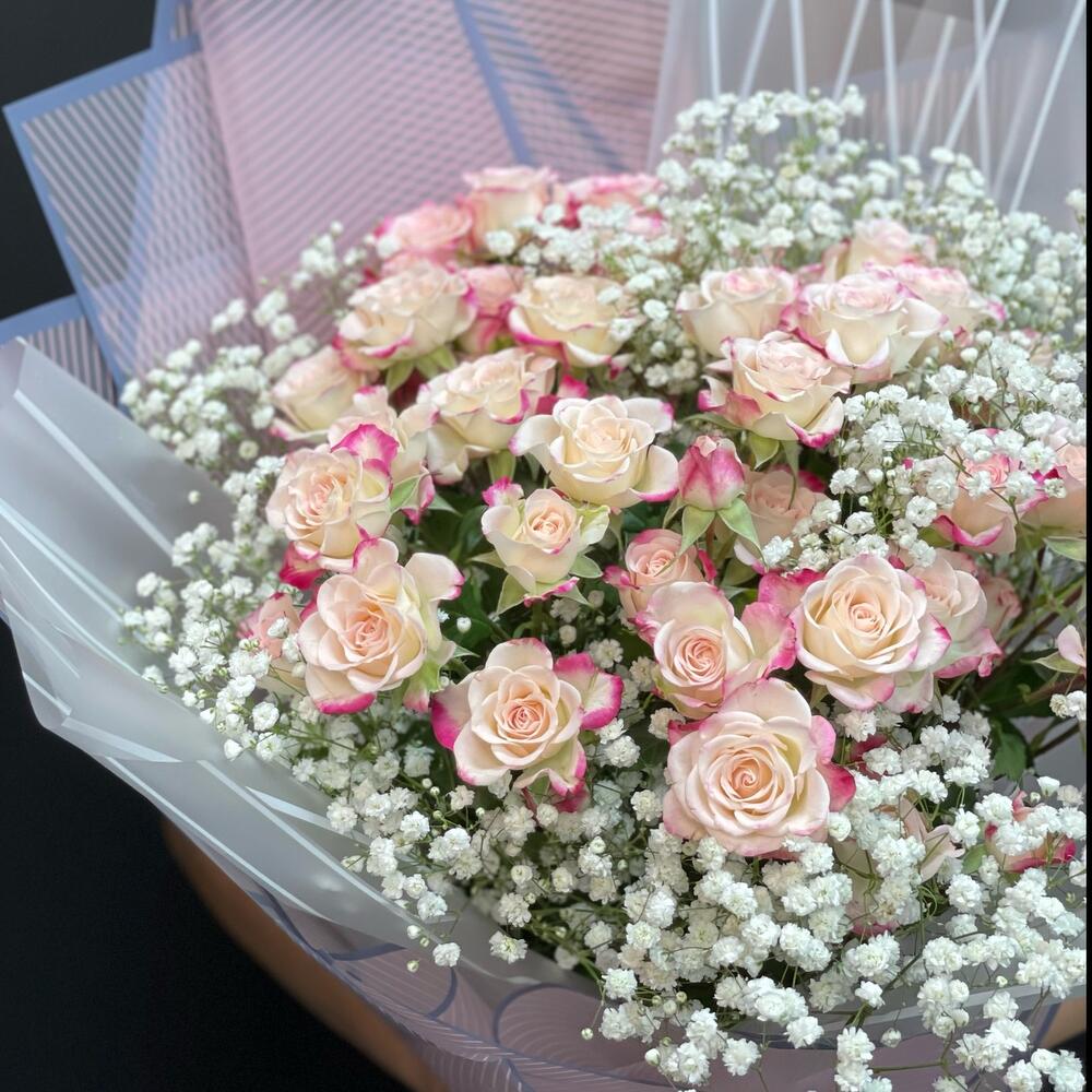 Гипсофила – 6 шт.Лента атласная – 2 шт.Упаковка дизайнерская – 6 шт.Кустовая роза 60 см – 7 шт.