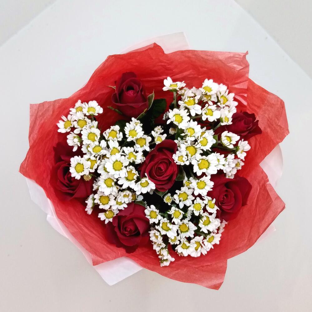Хризантема кустовая Сантини – 3 шт.Дизайнерская упаковка – 1 шт.роза кения – 6 шт.