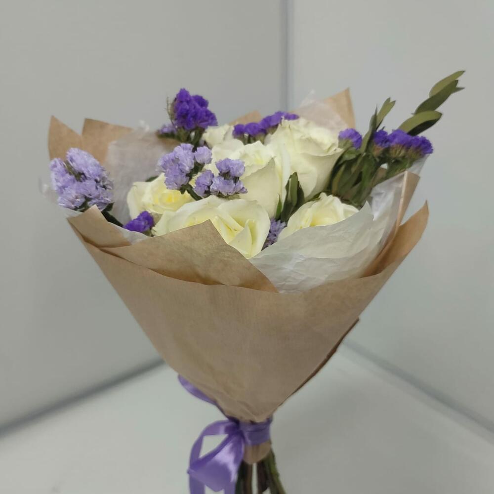 роза кения – 7 шт.Статица – 2 шт.Эвкалипт – 1 шт.Дизайнерская упаковка – 1 шт.