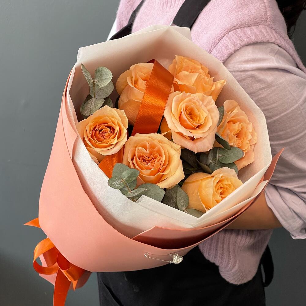Лента – 1 шт.Эвкалипт – 2 шт.Роза одноголовая – 7 шт.Упаковка дизайнерская – 2 шт.игла декоративная – 1 шт.