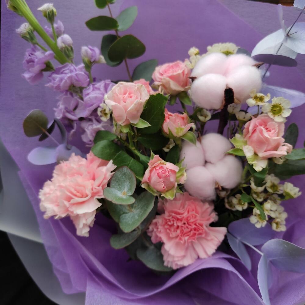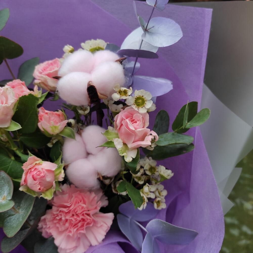 Роза кустовая – 1 шт.Диантус – 2 шт.Хлопок – 2 шт.Маттиола – 1 шт.Эвкалипт – 1 шт.Ваксфлауэр – 1 шт.Лента – 2 шт.Упаковка дизайнерская – 2 шт.