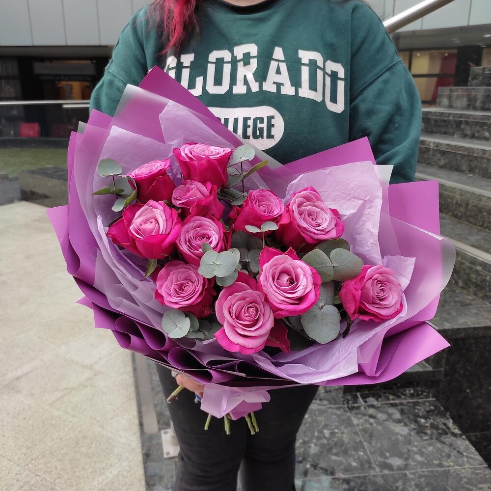Роза – 11 шт.Эвкалипт – 1 шт.Лента – 2 шт.Упаковка дизайнерская – 2 шт.