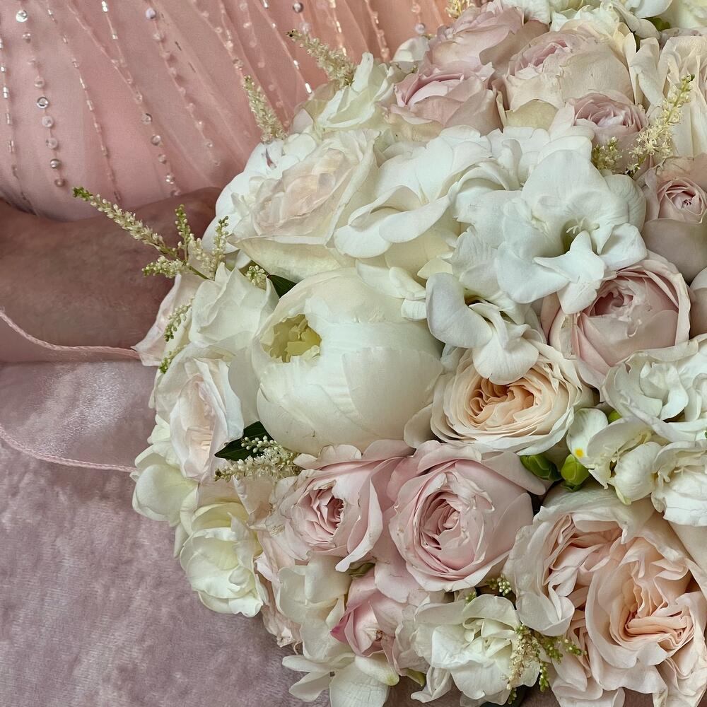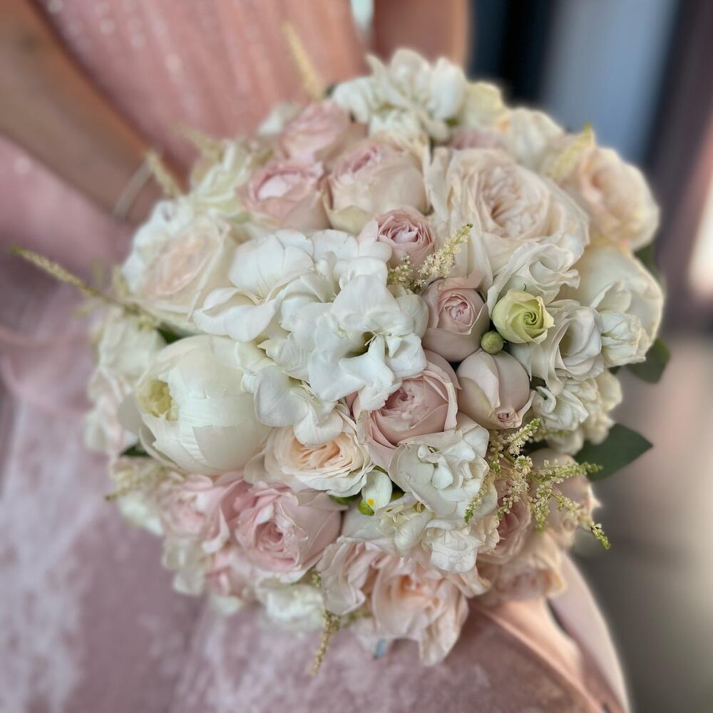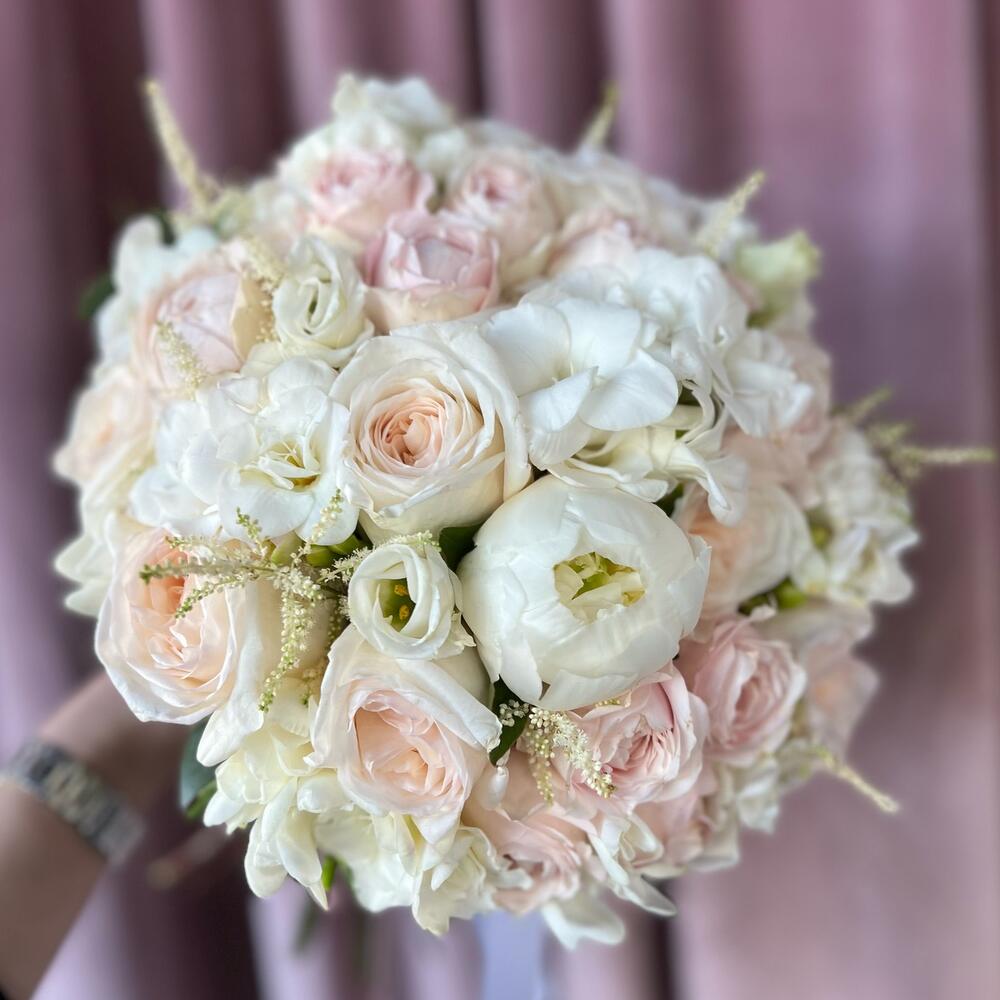 Астильба – 7 шт.Лизиантус – 5 шт.Фрезия – 9 шт.Пионовидная роза – 11 шт.Атласная лента – 2 шт.Кустовая пионовидная роза – 5 шт.пионы – 3 шт.