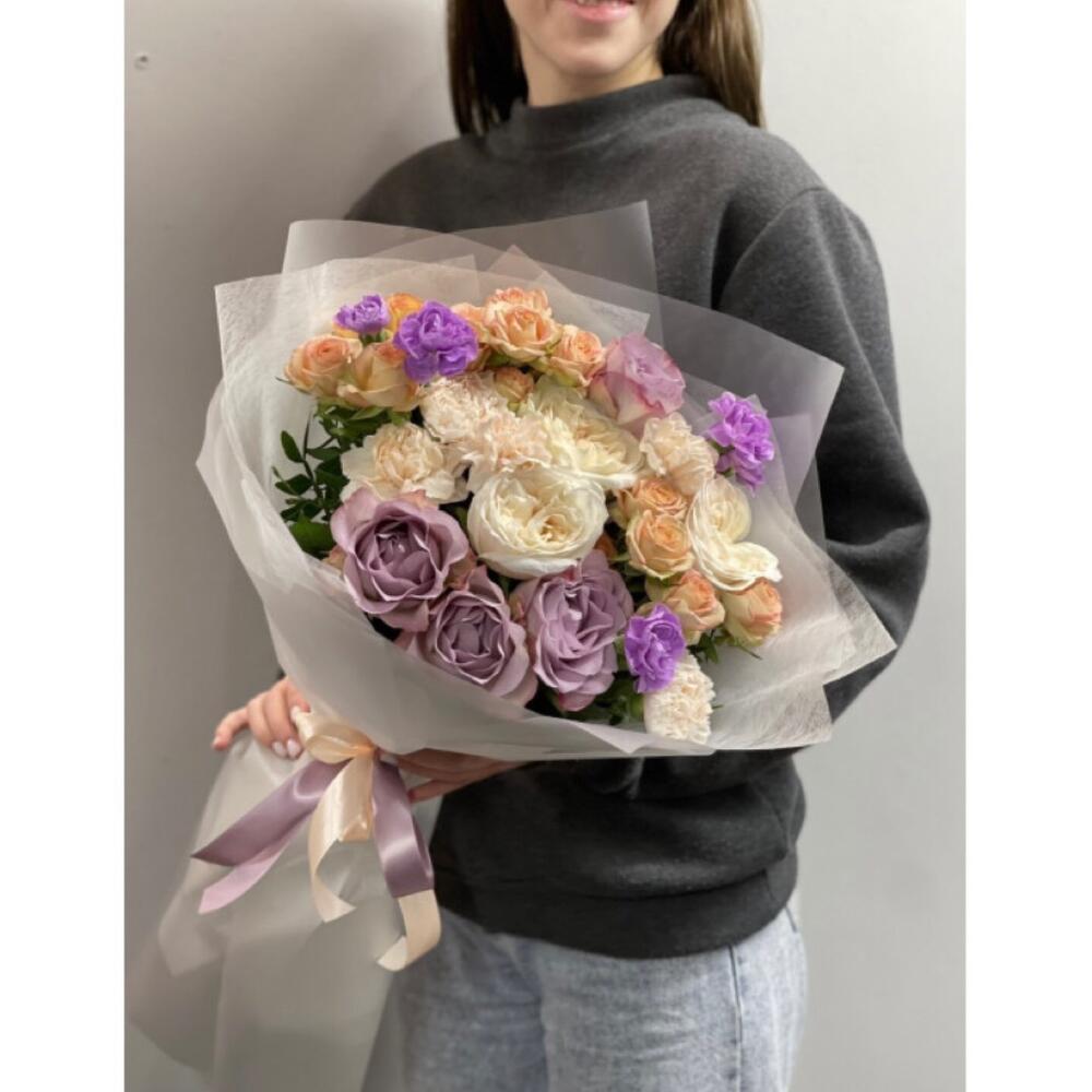 Альстромерии, Гвоздики, Кустовые розы, Лизиантусы, Розы, Хризантемы
