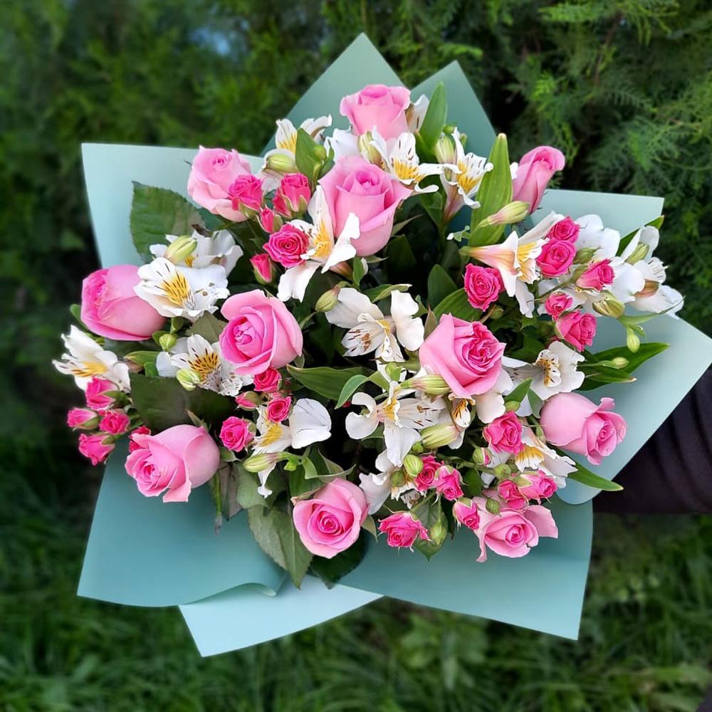 Чудесный букет из розовых роз, белых альстромерий и розовых кустовых роз в стильном оформлении.