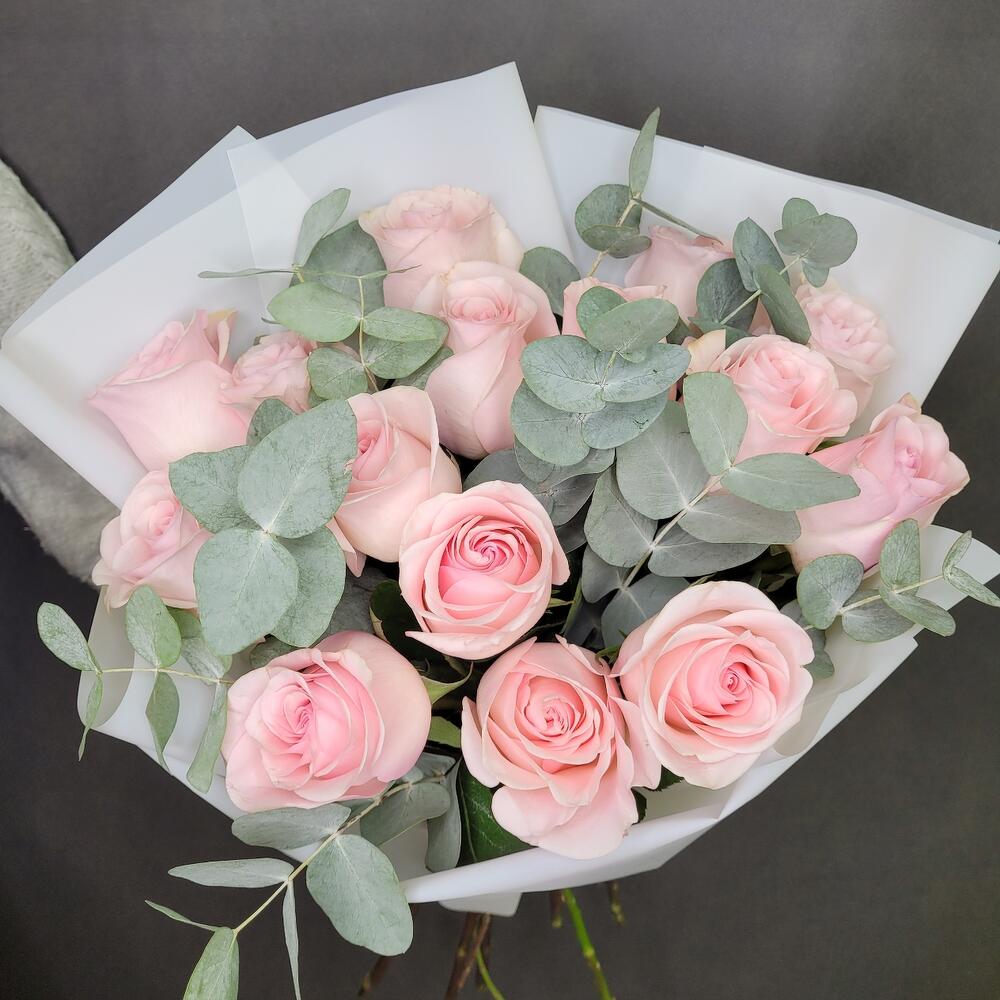 Букет розовых Роз и Эвкалипта