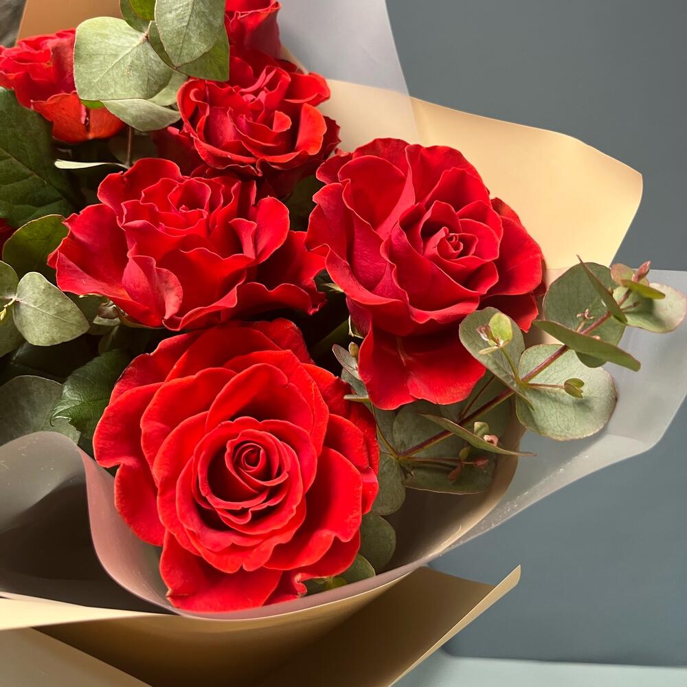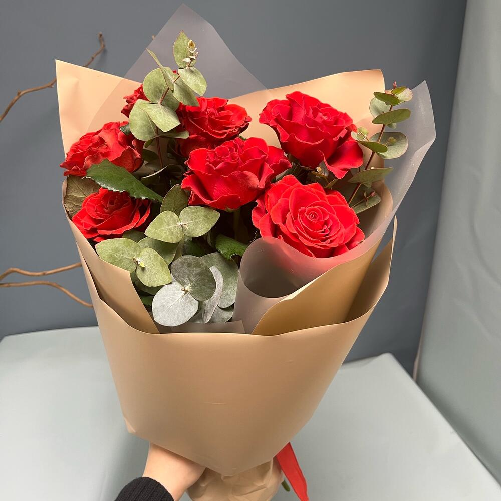 Эвкалипт – 3 шт.Роза одноголовая – 7 шт.Лента атласная – 1 шт.Упаковка дизайнерская – 2 шт.