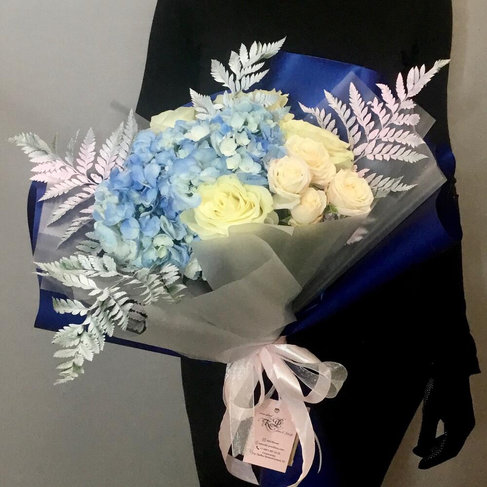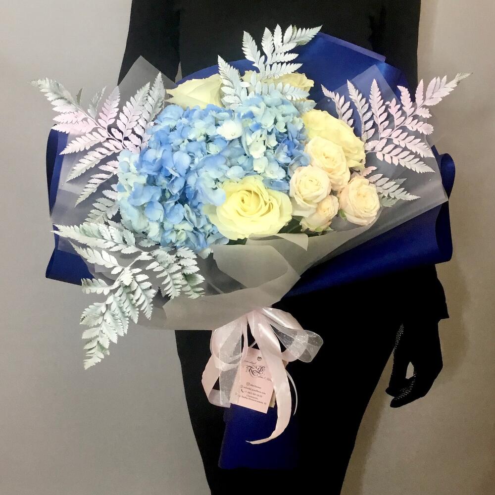 Кустовая роза – 1 шт.Лента атласная – 1 шт.Гортензия голубая – 1 шт.Лента органза – 1 шт.Роза Мондиаль Эквадор – 4 шт.Листья папоротника – 4 шт.Пленка дизайнерская – 2 шт.