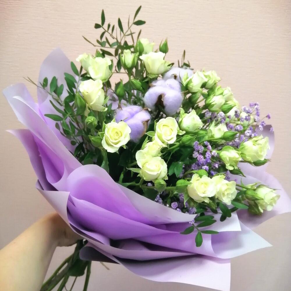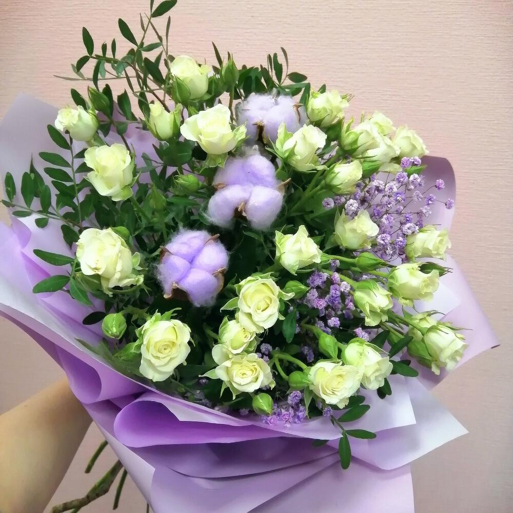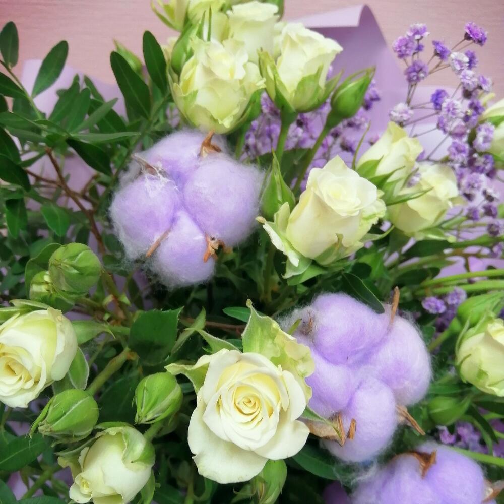 Роза кустовая – 5 шт.Гипсофила – 1 шт.Хлопок натуральный – 3 шт.Фисташка – 2 шт.Упаковка – 1 шт.